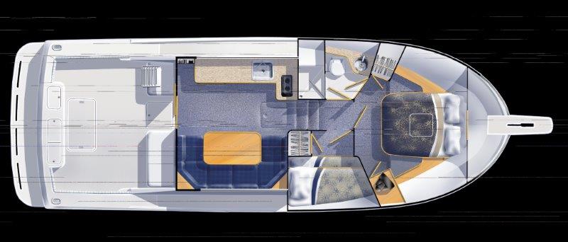 The 30’ Skipjack flybridge is equipped with one of the best layouts in the 30 foot range and is ideally designed for fishing and coastal cruising. Generous unobstructed cockpit (75 sq-ft), wide side decks, thigh high stainless steel hand rails, a very comfortable flybridge with seating for 5 adults, a volumous interior with excellent visibility and superb ventilation. Accommodations for six this is a perfect family cruiser or weekend fishing machine. Engine access is simply located beneath the cockpit sole with the touch of a button the entire deck raises to easily access all machinery.